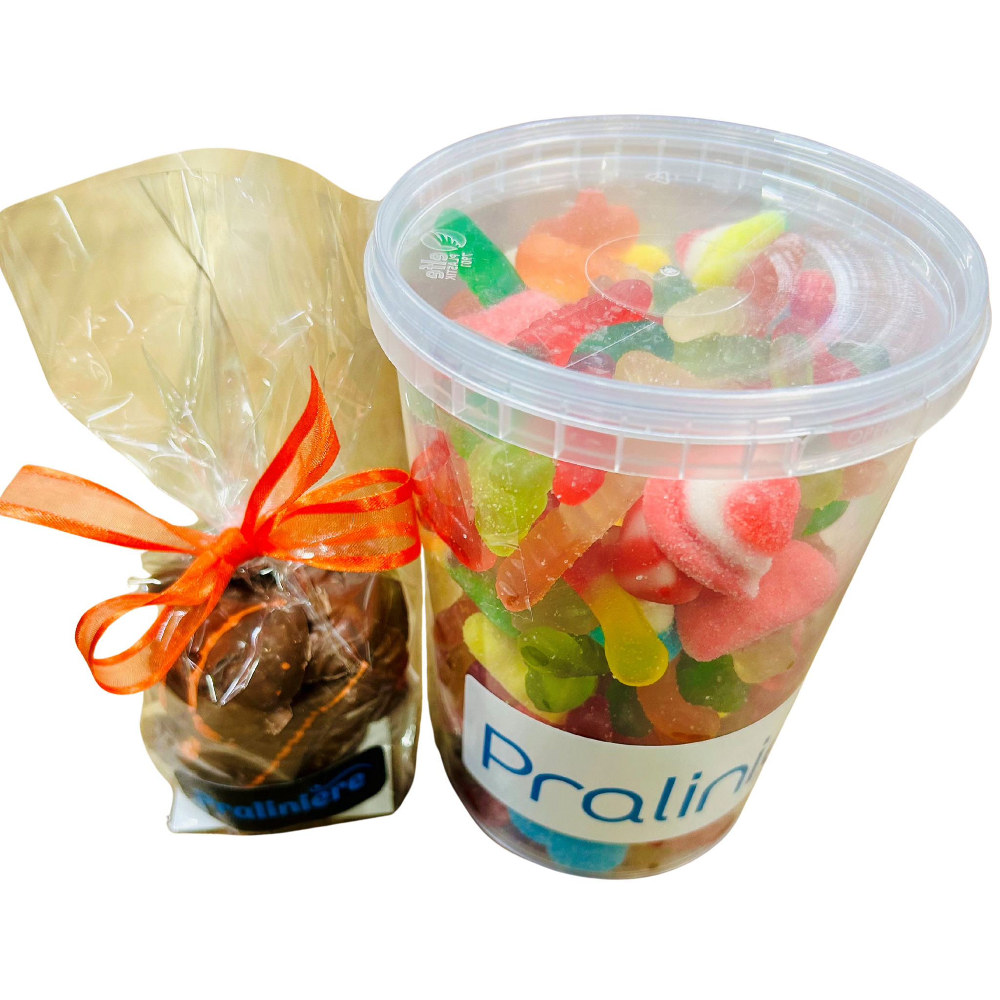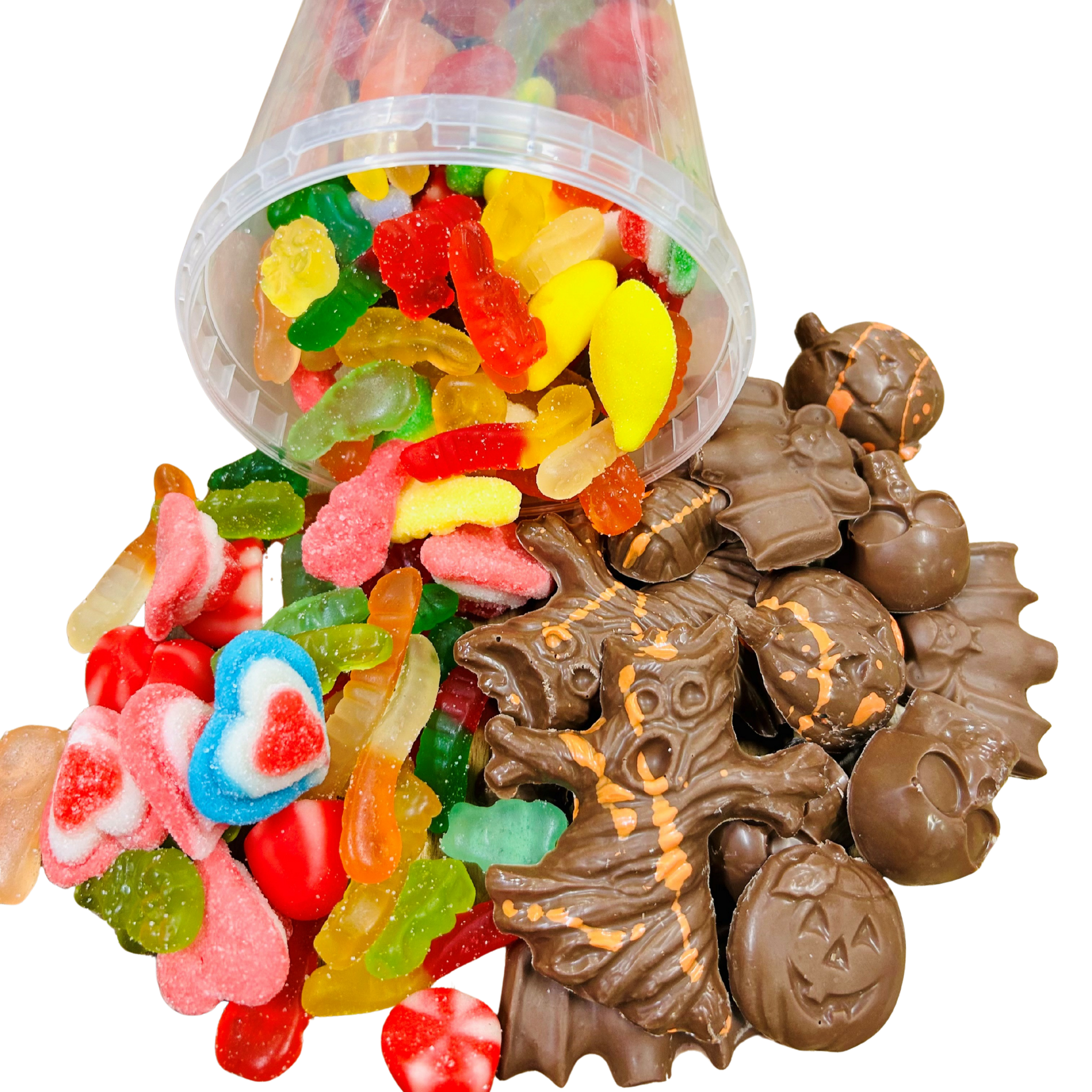 Ce combo comprend deux produits incontournables : un grand plat de 750 grammes de bonbons et jujubes variés, ainsi qu’un sachet de 130 grammes de chocolats au lait artisanaux moulés en formes d’Halloween. Une combinaison parfaite pour satisfaire les amateurs de sucreries et les mordus de bon chocolat.
