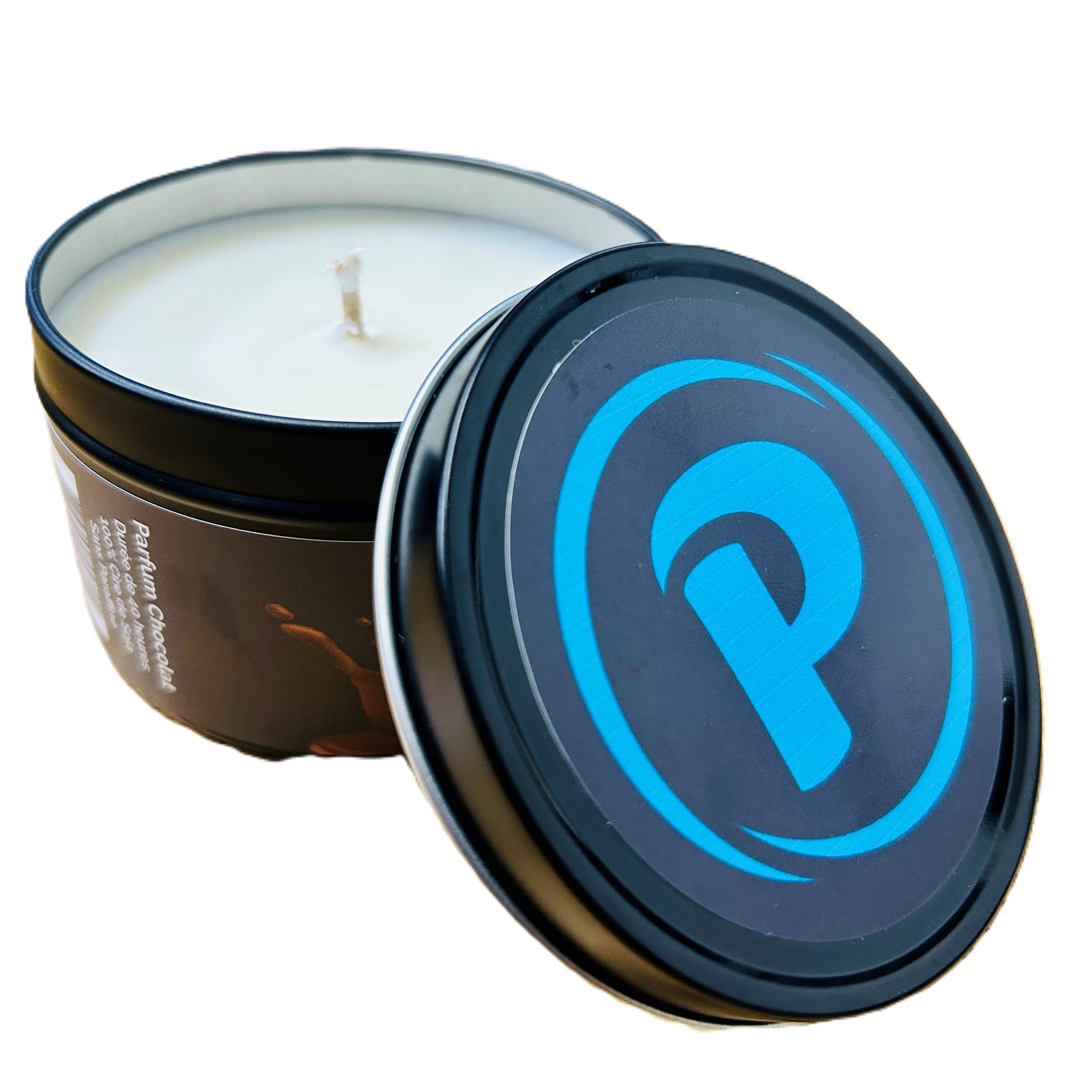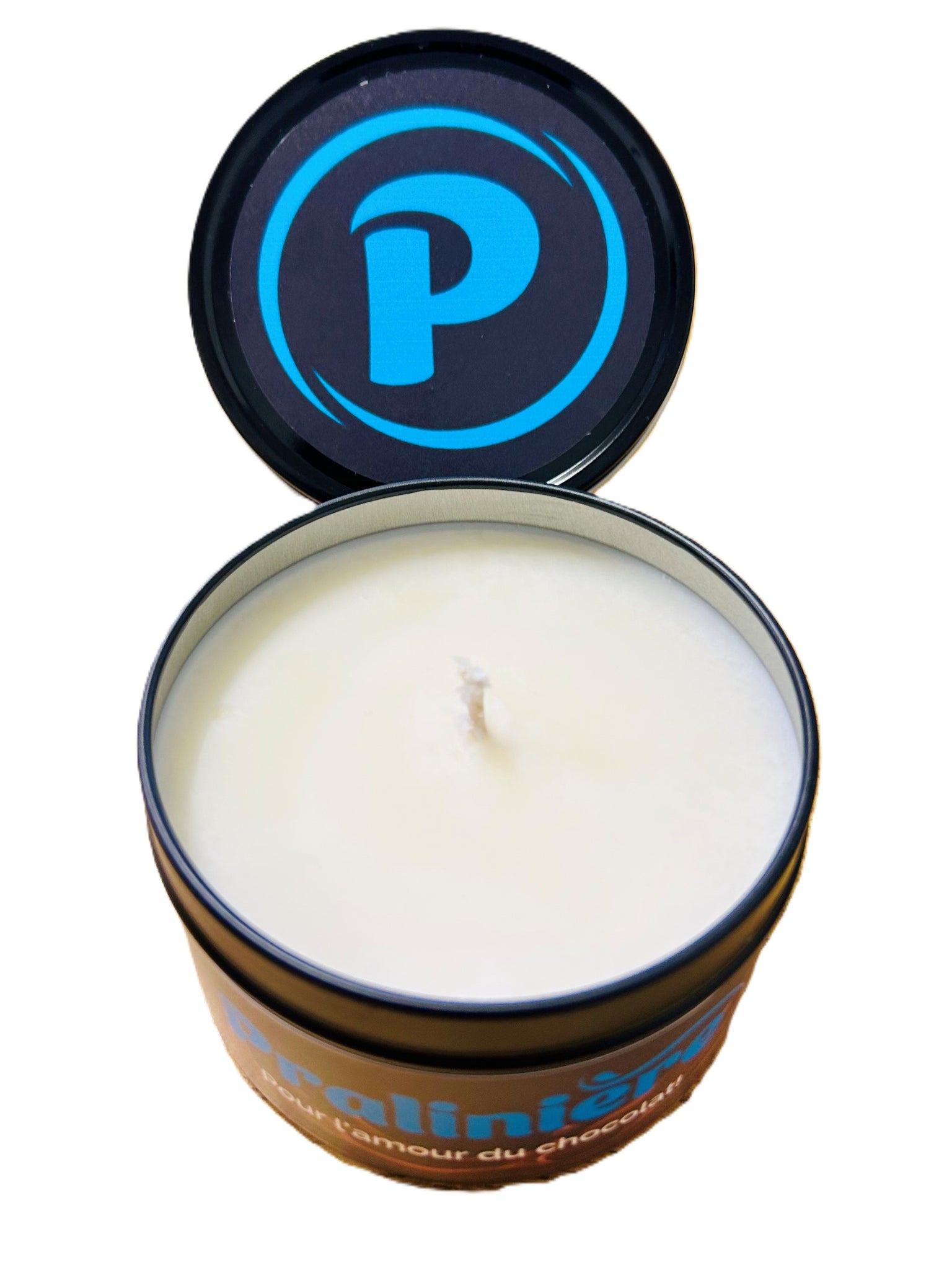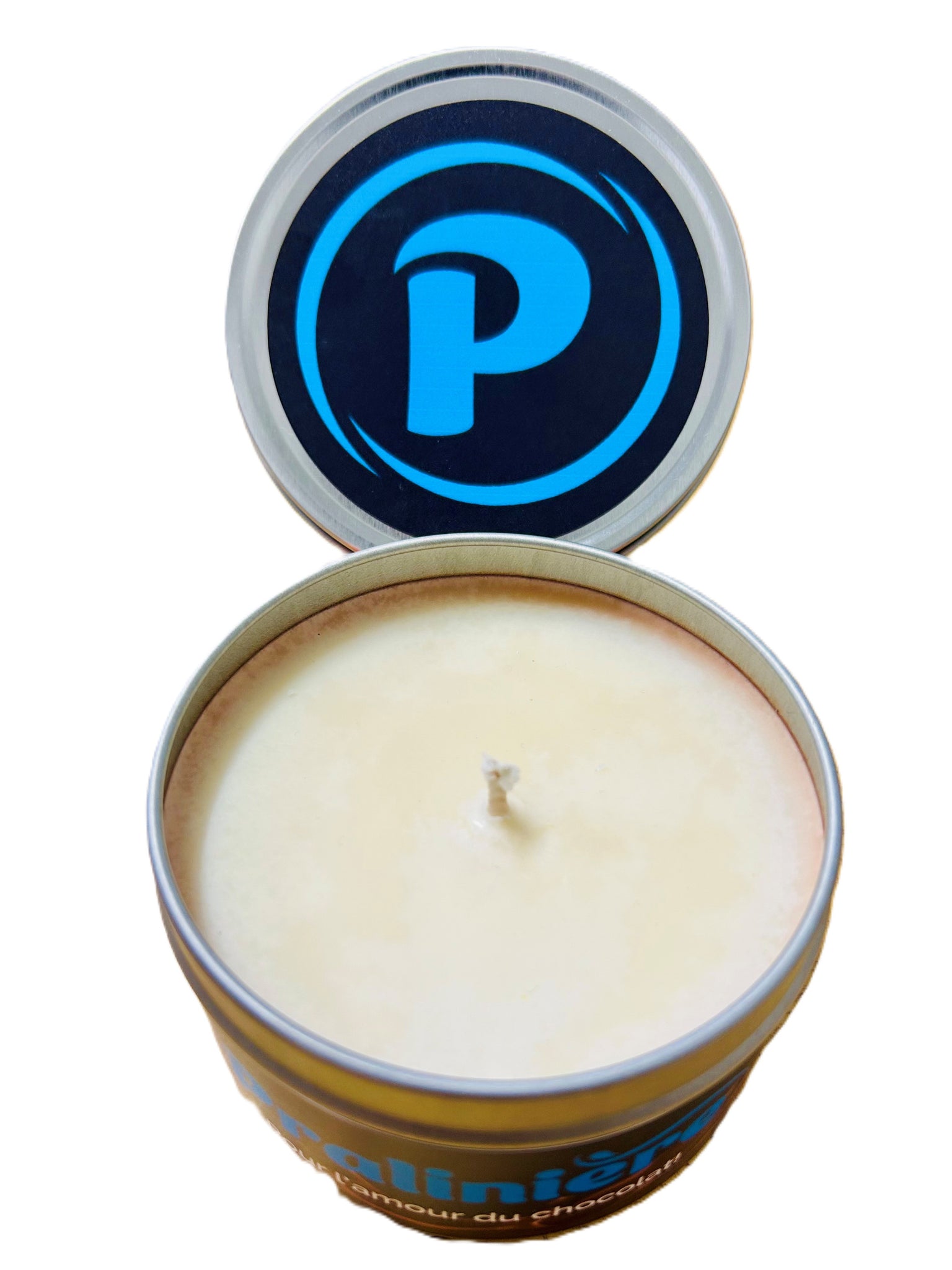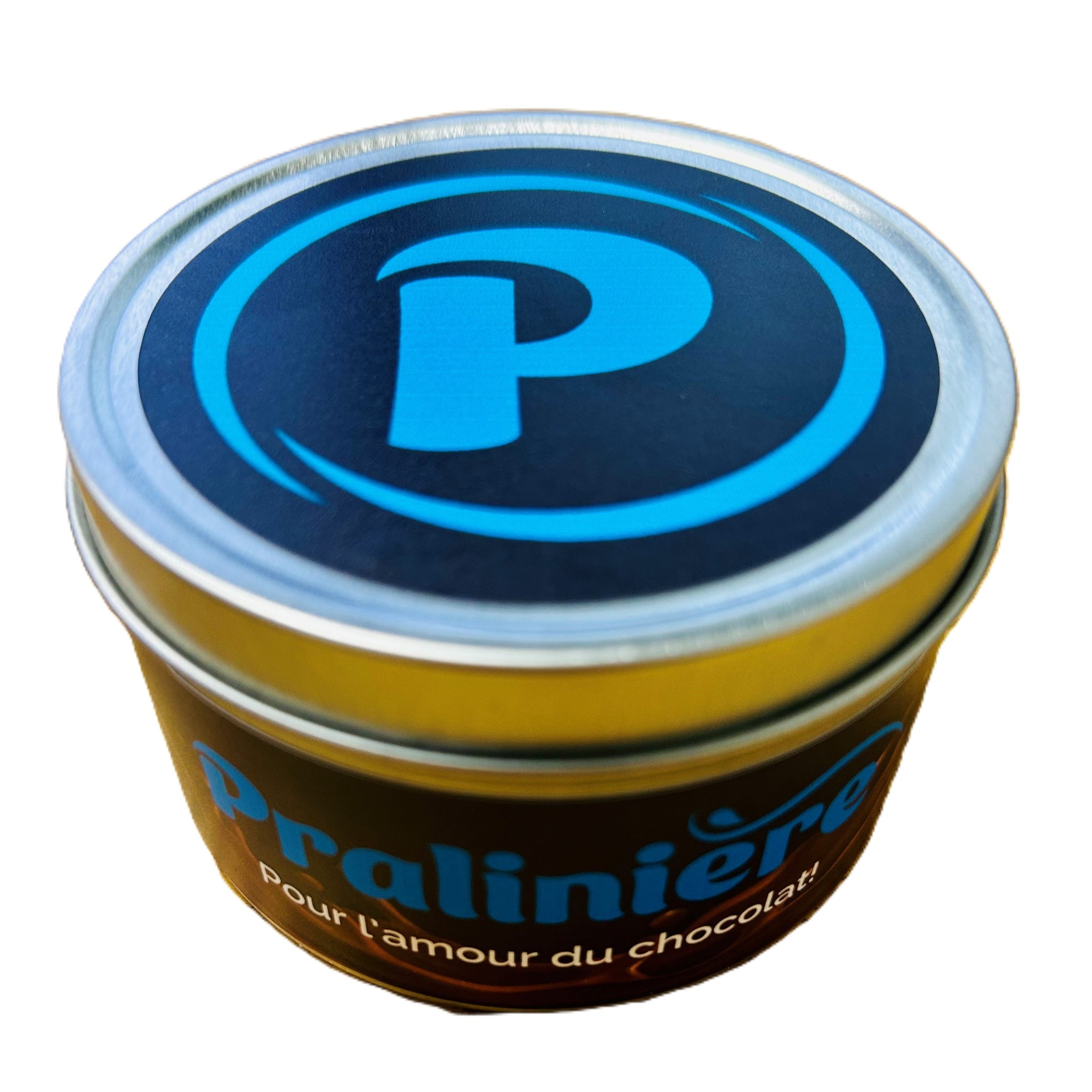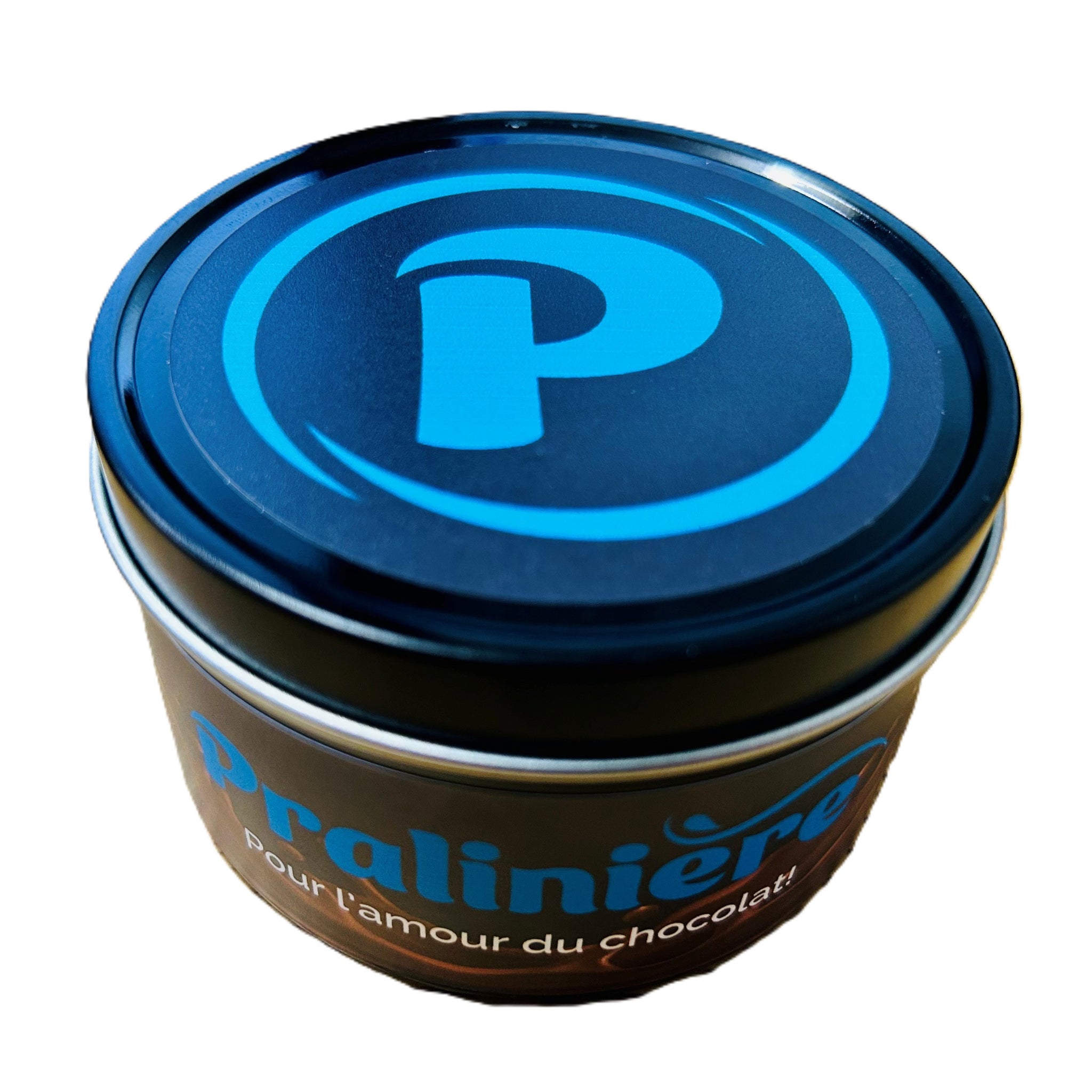 Chaque chandelle est coulée dans un contenant métallique élégant au logo de La Pralinière, pour une touche raffinée et un clin d’œil à notre passion du chocolat.
